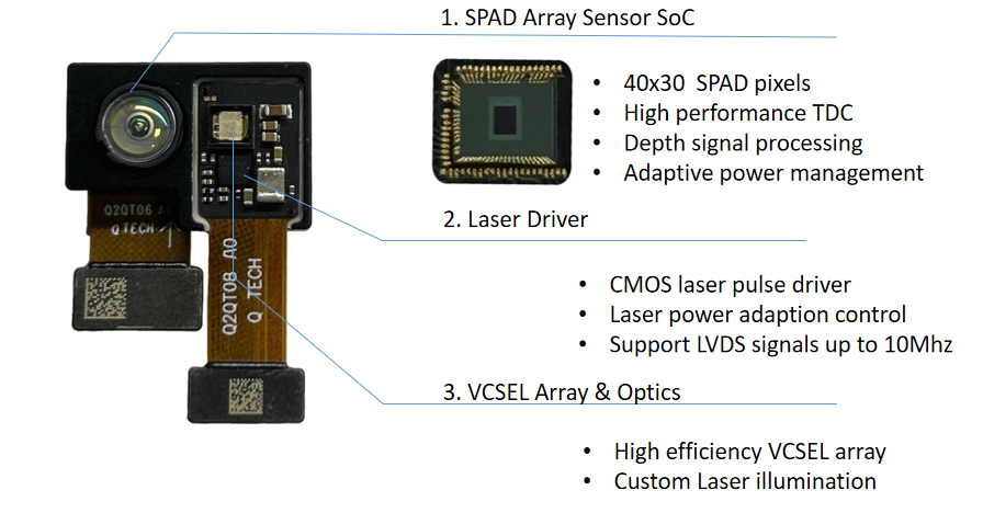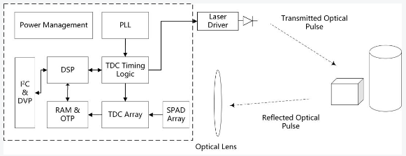 VA6320是一款集成了全局快門40x30 SPAD(單光子雪崩光電二極管)像素陣列、前端時間到數字轉換器和深度DSP處理器的1/18英寸ToF(飛行時間)成像傳感器。配合脈沖激光發射器,該傳感器可以生成一個40x30的深度圖像。該傳感器提供支持直方圖模式和DSP模式數據格式的MIPI CSI-2接口。使用CSI-2單通道接口,傳感器能夠以全分辨率每秒30幀的速度進行圖像傳輸。傳感器內部包含一個微處理器(MCU),用于實現軟件補丁和增強系統的可編程性。此外,它還集成了一個照明控制器和一個SPI接口,允許配置ToF模塊中的下游LDD(激光二極管驅動器),使傳感器能夠直接訪問模塊內存(如EEPROM或Flash)中的校準數據和固件代碼。